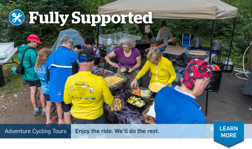 An Adventure Cycling fully supported tour is a great choice for the adventure-hungry cyclist who prefers riding with a larger group and a smaller load — the individual who relishes the freedom of riding unencumbered but still enjoys camping and a cycling challenge. The dynamics forged and friendships made in the larger groups are regularly cited as some of the greatest benefits of a cycling tour (group size ranging from 40 to 90 participants).